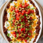 This Baked Taco Dip is a crowd-pleasing appetizer featuring layers of seasoned ground beef, creamy cheese mixtures, salsa, and a melty Mexican cheese blend, topped with fresh vegetables and served warm with crunchy tortilla chips. Perfect for game days, parties, or casual gatherings.