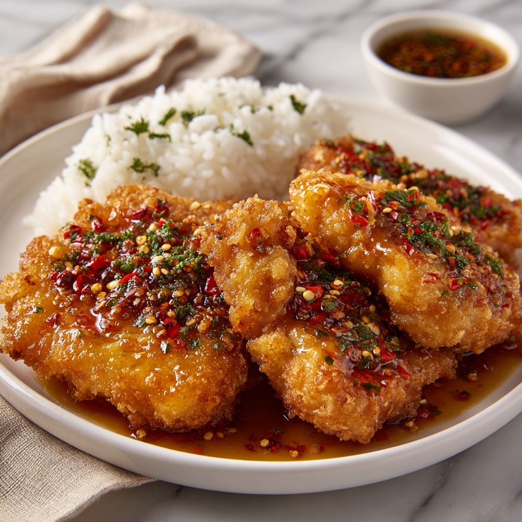 - Toss and Serve: Drizzle or toss the crispy chicken with the prepared bang bang sauce. Garnish with chopped parsley and serve immediately while warm.