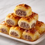 Classic British Sausage Rolls made with flaky puff pastry wrapped around a savory mixture of seasoned ground sausage and onion, baked to golden perfection. Perfect as a snack, appetizer, or party treat, these sausage rolls deliver a delightful balance of crispy exterior and juicy filling in about 40 minutes.