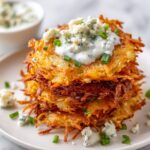 These Buffalo Latkes with Blue Cheese Dip combine crispy, golden potato pancakes with a spicy buffalo wing sauce twist, served alongside a creamy, tangy blue cheese dip. Perfect as an appetizer or a snack, this recipe adds a flavorful kick to traditional latkes with easy-to-follow steps and simple ingredients.