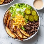 - Assemble the bowls: Divide the crispy cooked potatoes among serving bowls. Add shredded lettuce to fill the remaining space in each bowl. Top with the cooked ground beef, cheese (either sliced or shredded), and pickle slices. Drizzle the homemade burger sauce over everything and serve immediately for the best taste.