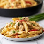 Reheat leftovers gently on the stovetop over low heat with a splash of chicken broth or cream to revive the sauce’s creaminess. Alternatively, microwave in short bursts, stirring often to heat evenly without drying out the chicken or pasta.