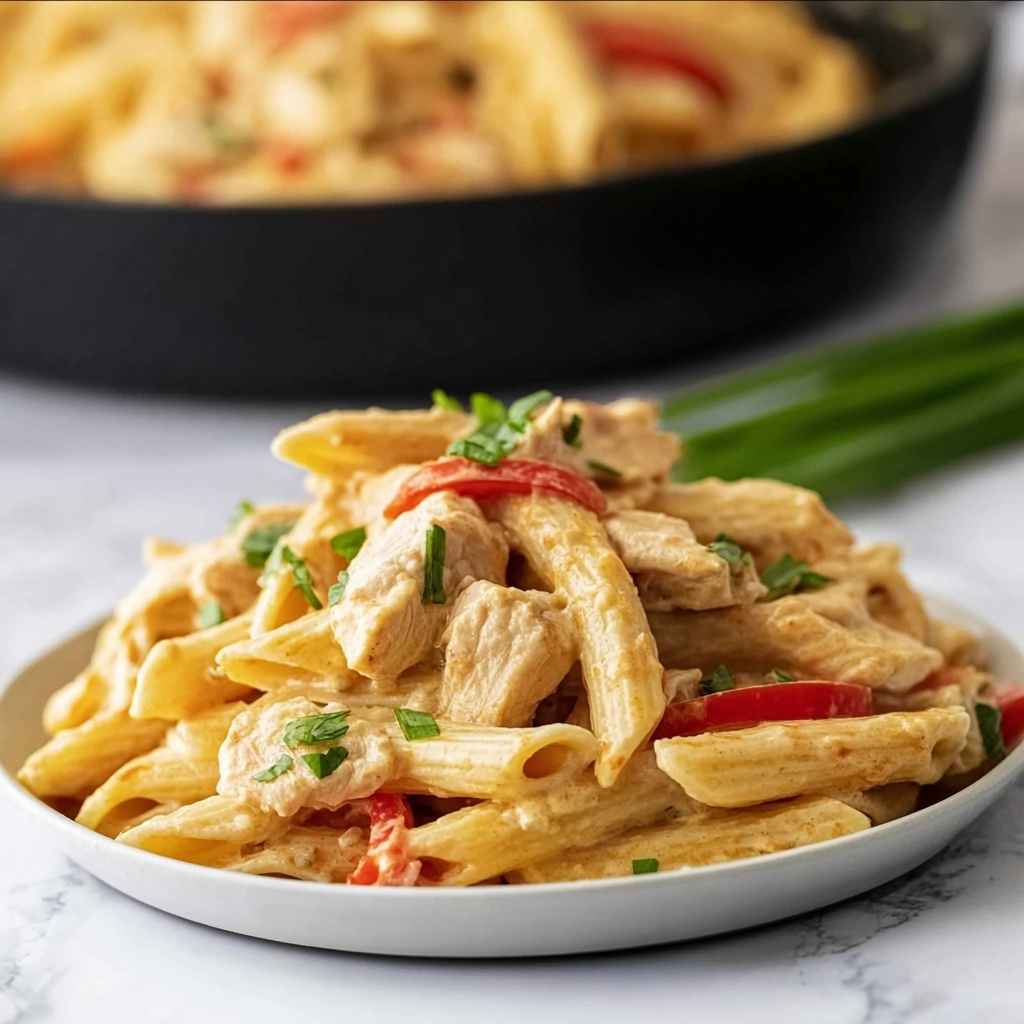 Finally, fold the cooked penne pasta into the skillet, gently stirring to coat every piece in that irresistible sauce. Allow everything to heat together briefly so all the flavors meld perfectly. To finish, sprinkle the chopped green onions over the top for a fresh, crisp contrast that brightens the plate. Serve immediately and get ready for everyone to ask for seconds!