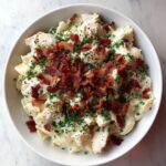 - Finish and Serve: Adjust seasoning with salt and pepper as needed. Top with cooked ranch chicken pieces and crumbled bacon. Garnish with chopped parsley and serve immediately for best flavor and texture.