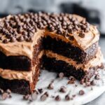 14. Frost the Cake: Use an offset spatula to spread the chocolate frosting evenly over the top and sides of the entire cake. Decorate with extra mini chocolate chips and drizzle chocolate sauce if using.