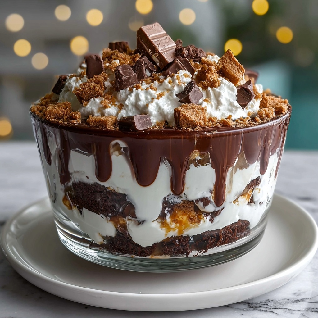 - Finish with toppings: On the final whipped cream layer, sprinkle the chopped Heath or Skor bars generously over the top, and add more fudge sauce if desired for extra decadence.