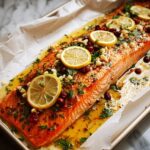 This Christmas Baked Salmon recipe features a beautifully seasoned salmon fillet brushed with a flavorful mixture of olive oil, garlic, Dijon mustard, honey, lemon, and fresh herbs. Topped with vibrant pomegranate seeds and chopped pistachios, this festive dish is both elegant and delicious, perfect for holiday gatherings or a special family dinner.