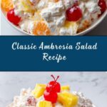 Classic Ambrosia Salad is a sweet, creamy fruit salad featuring mandarin oranges, crushed pineapple, mini marshmallows, shredded coconut, and maraschino cherries, all combined with sour cream and whipped topping. This refreshing and easy no-cook dish is perfect as a dessert or a holiday side, offering a delightful blend of textures and flavors that can be prepared ahead of time for convenience.