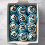 Yes! The frosting is a creamy blend of cream cheese, butter, powdered sugar, vanilla, and a splash of milk, tinted with blue gel coloring. It’s tangy, sweet, and velvety—just what these rolls need.