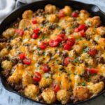- Top with tater tots: Arrange the frozen tater tots in a single layer on top of the beef mixture, covering the surface completely for a crispy topping.
