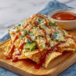 Whisk together the sweet chili sauce and soy sauce, then generously drizzle this vibrant, tangy mixture over your nachos. Finish with a sprinkle of chopped green onions, toasted sesame seeds, and fresh cilantro if you like a pop of herbal brightness. Serve immediately to enjoy the ideal contrast between the crunchy chips and creamy topping.