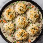 This comforting Chicken and Biscuits recipe combines a creamy, savory chicken and vegetable filling with fluffy, golden biscuits baked on top. Perfect for a hearty family meal, the filling is made with sautéed onions, carrots, celery, chicken broth, and tender chicken pieces, while the biscuits are made from Bisquick and cheese for a deliciously flaky topping.