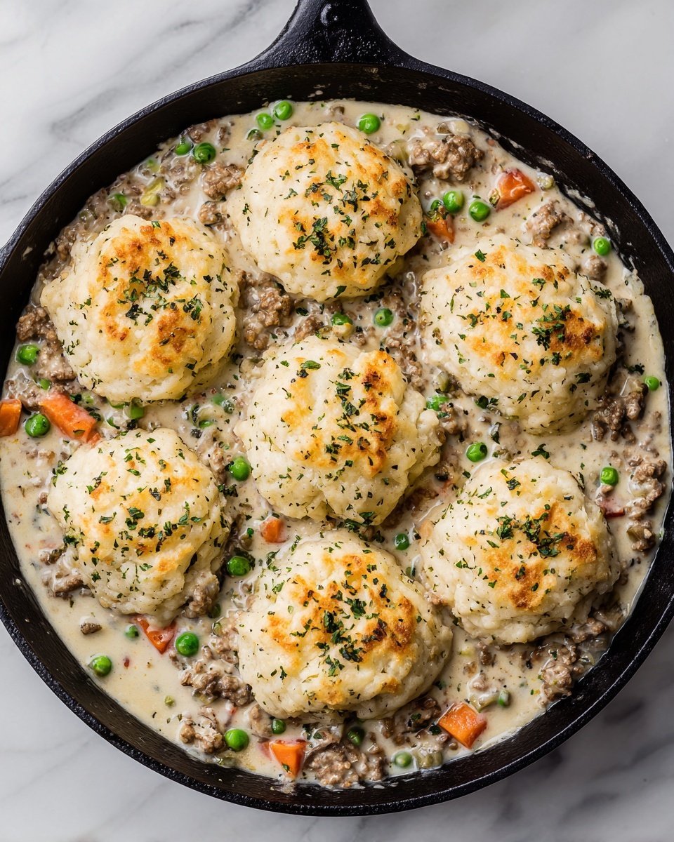 - Assemble and Bake: Remove the casserole dish from the oven and stir the filling to recombine slightly. Drop spoonfuls of biscuit dough (~¼ cup each) evenly over the hot filling to form about 8 biscuits. Return the dish to the oven and bake uncovered for 12 minutes until the biscuits are golden brown and a toothpick inserted comes out clean.