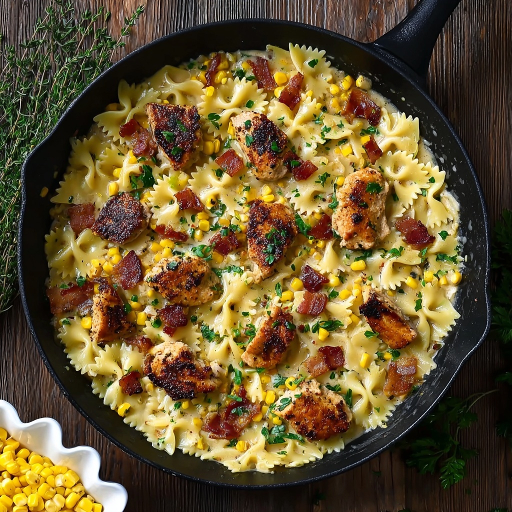 Creamy Chicken Corn Pasta with Bacon is a comforting and flavorful dish featuring tender chicken strips seasoned with smoked paprika and Italian herbs, mixed with sweet corn kernels and a rich Parmesan cream sauce, all tossed with farfalle pasta. Crispy bacon and fresh herbs add delicious contrast and texture, creating a satisfying meal ready in just 30 minutes.