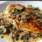 Return the seared chicken to the pan, nestling it into the creamy mushroom sauce. Let everything simmer together for another 2 to 3 minutes so the chicken absorbs some of the delicious flavors. Serve this dish hot, spooning plenty of sauce over the top. It’s perfect atop fluffy mashed potatoes, buttery pasta, or even a bed of rice to soak up every last bit of sauce.