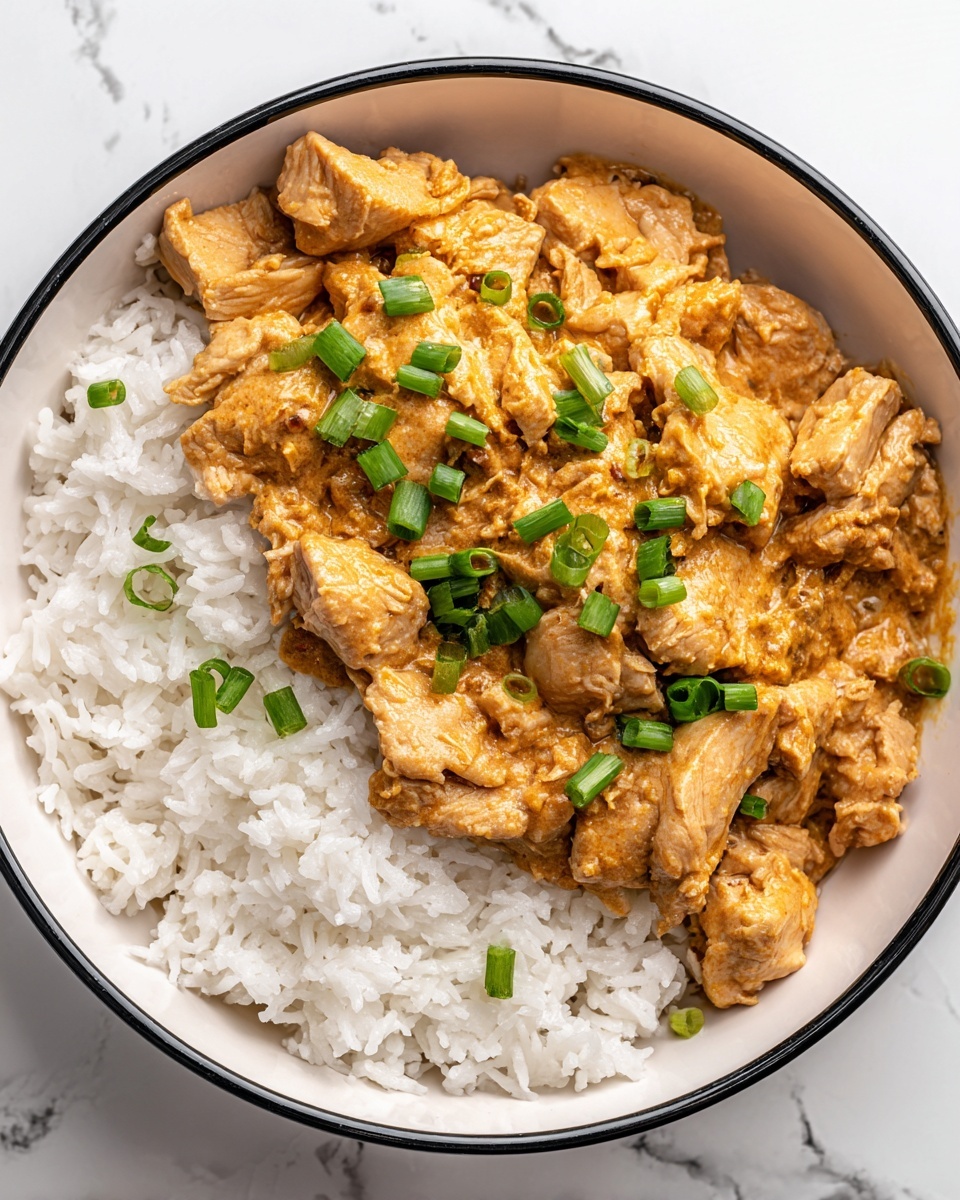Serve the chicken hot over fluffy cooked rice and garnish with sliced green onions to add a fresh, mild crunch that completes the experience.