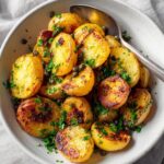 Once roasted to golden perfection, remove the potatoes from the oven and immediately toss them with chopped salted lemon and fresh parsley. The salty lemon brightens the dish with a punchy citrus note, while parsley adds a fresh, green finish that truly elevates the flavor profile.