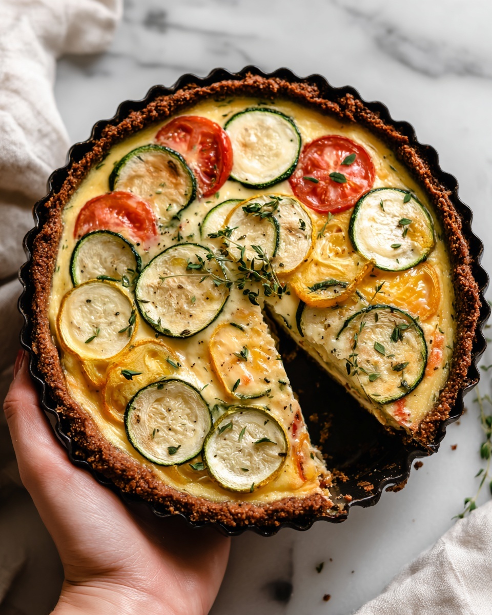 5. Garnish and Bake: Arrange reserved zucchini and tomato slices on top for garnish. Bake in a preheated oven at 350°F (175°C) for about 25-30 minutes until the quiche is set in the center and lightly golden.
