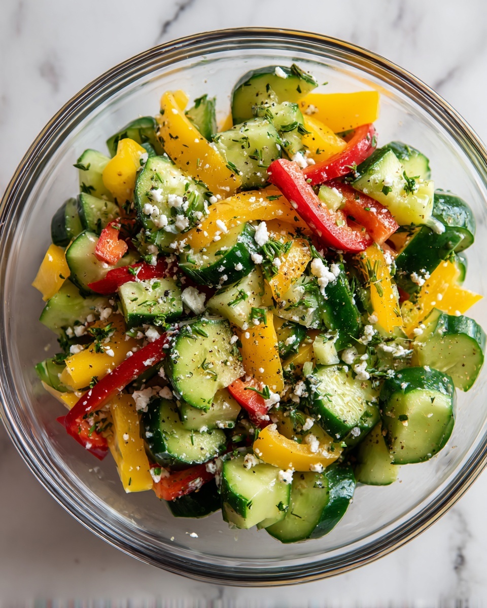 4. Combine and Toss: In a large mixing bowl, add cucumbers, bell peppers, red onion, and chopped herbs. Pour the dressing over the vegetables and gently toss until everything is evenly coated and looks glossy.
