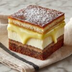 Allow the cake to cool completely before slicing into squares. This makes cutting neater and enhances the custard’s creaminess. For a charming finishing touch, dust the top lightly with powdered sugar just before serving.
