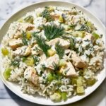 A simple and flavorful one-dish meal featuring tender baked chicken breast and long-grain rice infused with garlic and onion powders, topped with creamy tzatziki sauce and fresh dill. This dump-and-bake recipe is perfect for a quick, satisfying dinner with minimal prep and cleanup.