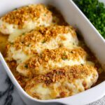 This Easy Baked Caesar Chicken recipe is a delicious and simple way to enjoy juicy chicken breasts topped with creamy Caesar dressing, melted provolone cheese, and crispy Caesar-style croutons, all baked to golden perfection in under 35 minutes.