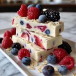A refreshing and healthy Frozen Yogurt Bark featuring creamy Greek yogurt swirled with honey and vanilla, studded with vibrant mixed berries, and topped with crunchy granola. Perfect for a guilt-free snack or a light dessert, this easy-to-make treat requires minimal preparation and freezes into a delightful chilled bark that’s bursting with flavor and texture.