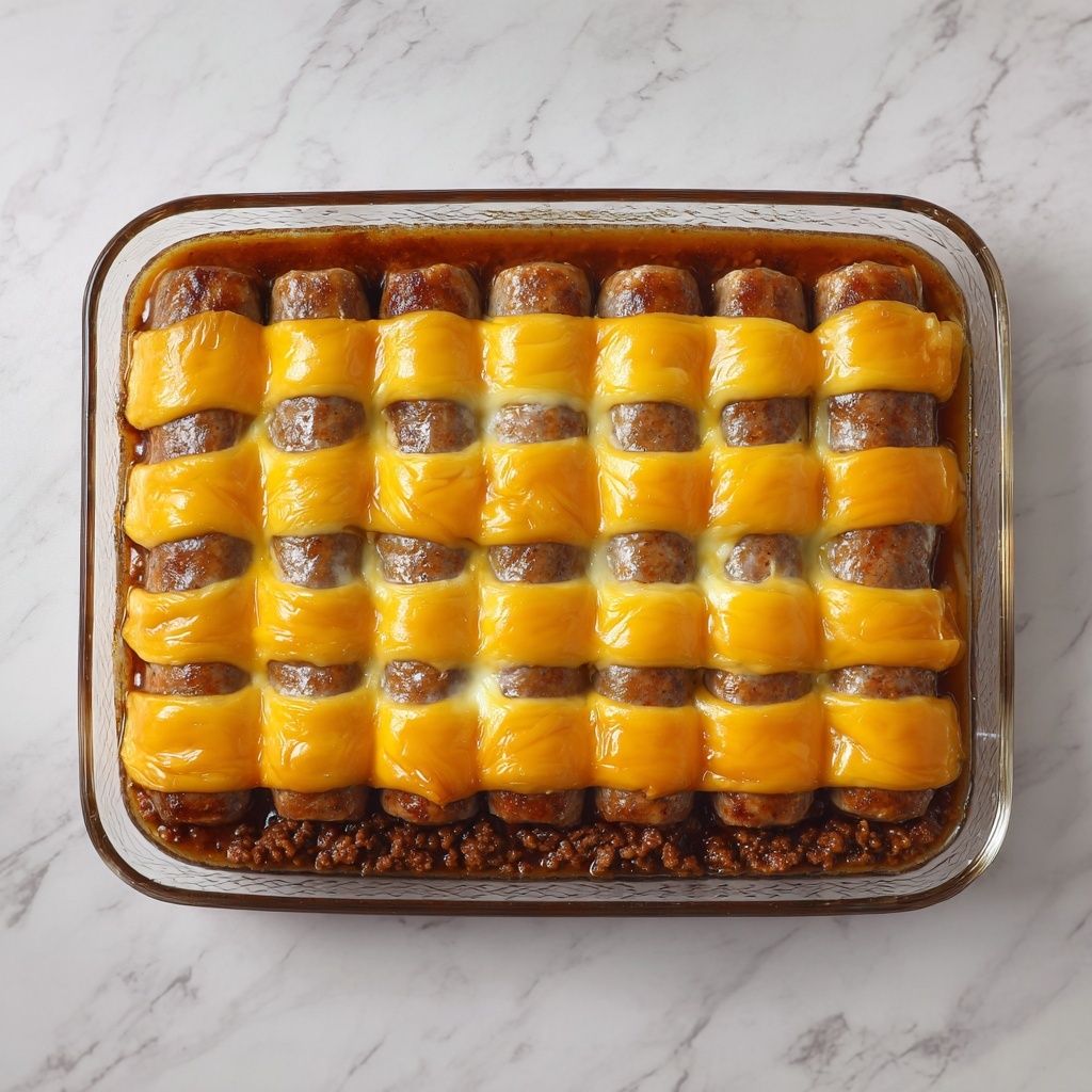 If you’re using hot dog buns, carefully split each one open and tuck a hot dog inside. Line them snugly in your prepared baking dish so they stay upright and cozy during baking. Prefer a fun twist? Use crescent roll dough instead: unroll it, wrap a triangle of dough around each hot dog, and place them seam-side down in the dish for an irresistible golden crust.