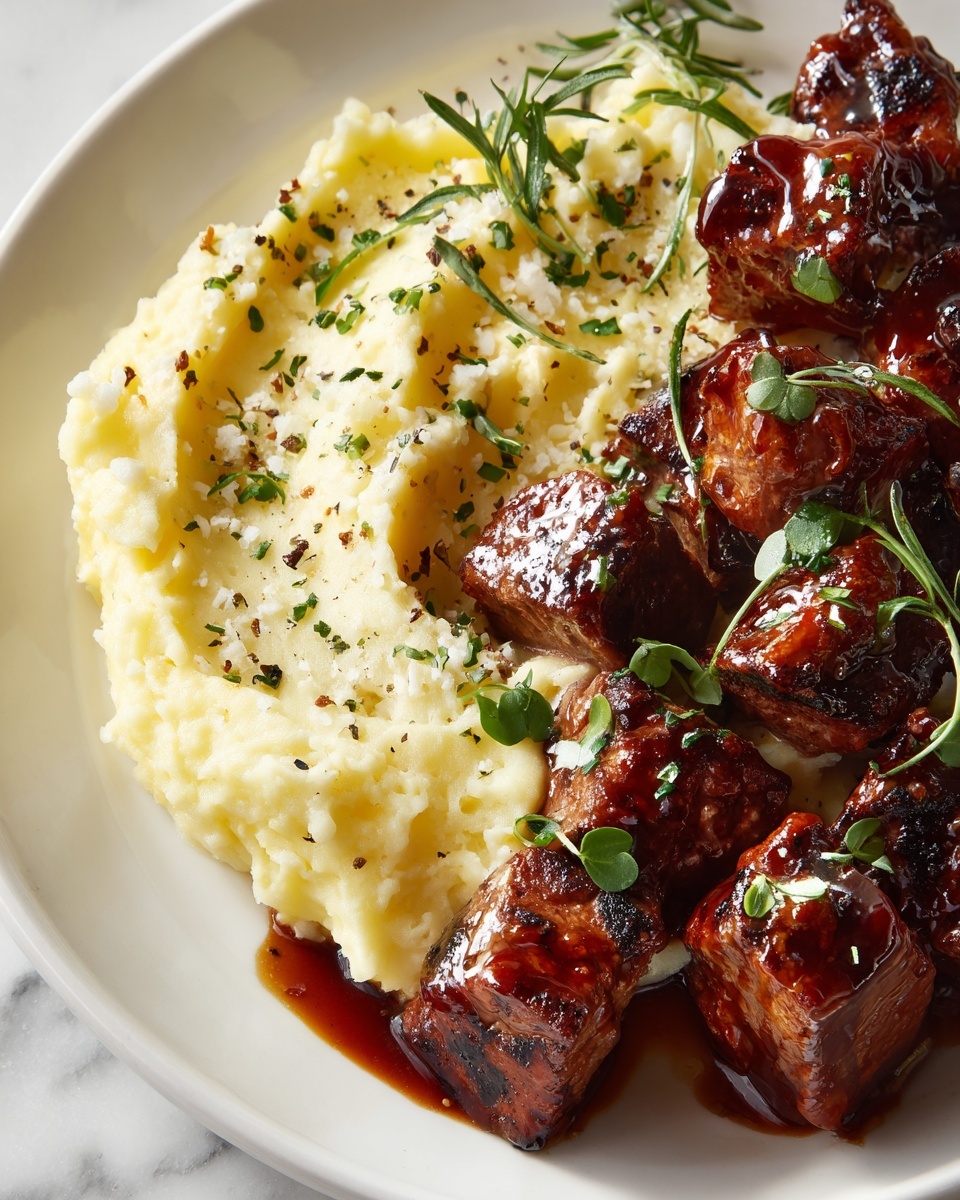 How to Serve Garlic Butter Beef Bites with Creamy Mashed Potatoes Recipe