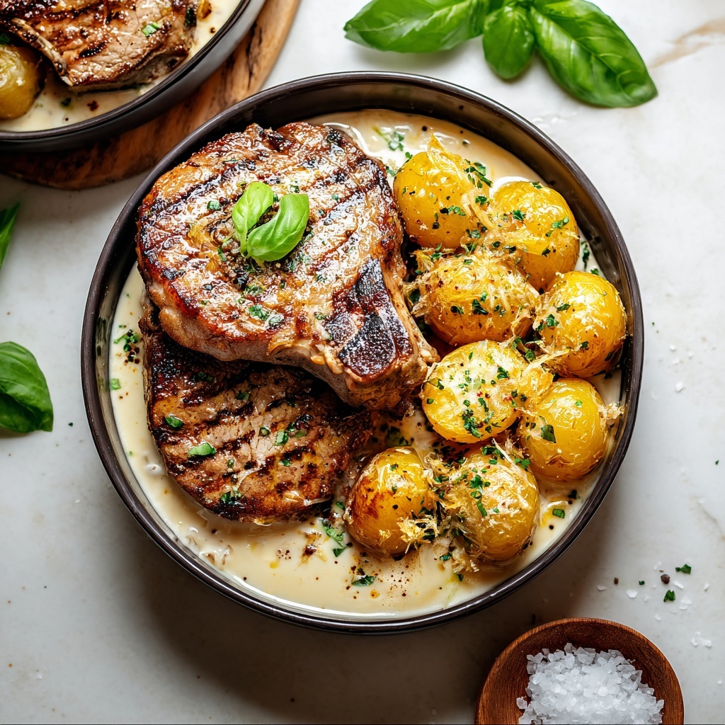 For a dinner party, serve the pork chops and potato bake on warm individual plates with a drizzle of the leftover garlic butter sauce from the pan. You could also portion the potato bake in ramekins for an elegant single-serving presentation that looks restaurant-worthy but feels homey.