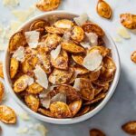 Enjoy a savory and crunchy snack with these Garlic Parmesan Pumpkin Seeds. Roasted to golden perfection and coated with fragrant garlic powder, kosher salt, and a generous sprinkle of finely grated Parmesan cheese, these seeds make a perfect healthy and flavorful treat. Ideal as a snack or a salad topping, this recipe transforms simple pumpkin seeds into a gourmet delight.