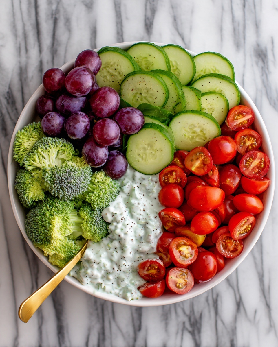 This salad works wonderfully alongside grilled chicken, fish, or a hearty Mediterranean grain bowl. Its bright, creamy dressing complements smoky, savory mains perfectly, making it a versatile side dish for any occasion.