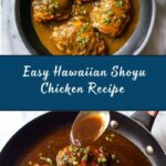 This Hawaiian Shoyu Chicken recipe features tender, juicy bone-in chicken thighs cooked in a sweet and savory glaze made from soy sauce, brown sugar, ginger, and garlic. The chicken is pan-seared to achieve a crispy skin, then simmered in a rich sauce until perfectly cooked. Finished with a thickened glaze and optional scallion garnish, this dish brings authentic island flavors to your dinner table in just 45 minutes.