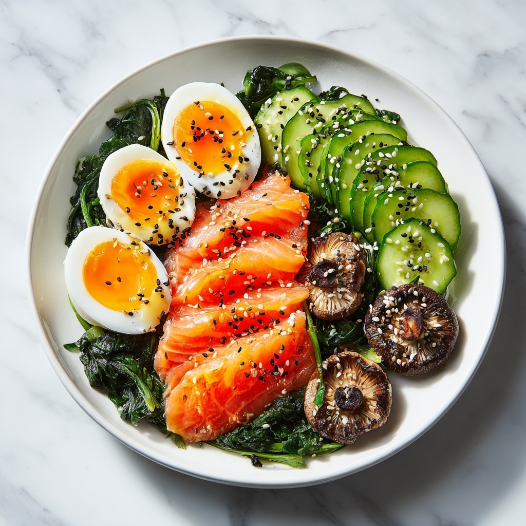 - Arrange Ingredients: On a large plate, neatly arrange the eggs, avocado slices, cherry tomatoes, cucumber slices, and a small handful of baby spinach or mixed greens to create a vibrant, balanced plate.