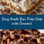 Heath Bar Poke Cake is a decadent dessert featuring a moist chocolate cake infused with sweetened condensed milk and caramel sauce, topped with fluffy whipped topping and crunchy Heath bar bits. This easy-to-make poke cake combines rich flavors and textures, perfect for parties and family gatherings.
