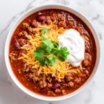 To elevate your bowl of chili, consider topping it with fresh chopped cilantro for a vibrant, herbal note. You can also add dollops of sour cream, shredded cheese, or creamy avocado slices. These garnishes add richness and contrast, transforming a simple bowl into something cozy and indulgent.