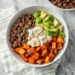 A flavorful and balanced Hot Honey Sweet Potato Beef Bowl combining roasted sweet potatoes, seasoned lean ground beef, creamy dairy-free cottage cheese, fresh avocado, and a spicy-sweet drizzle of hot honey. Perfect for a nutritious and satisfying weeknight meal.