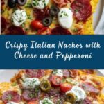 These Italian Nachos feature crispy fried pasta chips topped with marinara sauce, melted mozzarella and Parmesan cheese, pepperoni, and olives. Baked until bubbly and garnished with fresh basil and crushed red pepper flakes, they offer a delicious Italian twist on classic nachos, perfect for a fun appetizer or snack.