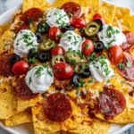 These Italian Nachos feature crispy fried pasta chips topped with marinara sauce, melted mozzarella and Parmesan cheese, pepperoni, and olives. Baked until bubbly and garnished with fresh basil and crushed red pepper flakes, they offer a delicious Italian twist on classic nachos, perfect for a fun appetizer or snack.