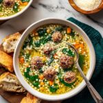 Italian Wedding Soup is a comforting, classic Italian-American soup featuring tender baked chicken or pork meatballs, sautéed vegetables, pasta, and fresh spinach in a flavorful chicken broth. This hearty soup is perfect for a cozy dinner and can be made ahead for convenience.