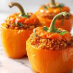 Celebrate Halloween with these festive Jack-O’-Lantern Stuffed Peppers. Bright orange bell peppers are carved with spooky faces and filled with a savory mixture of ground beef, seasoned rice, and tomato sauce. Baked until tender and flavorful, these stuffed peppers make a fun and hearty meal perfect for a seasonal dinner.