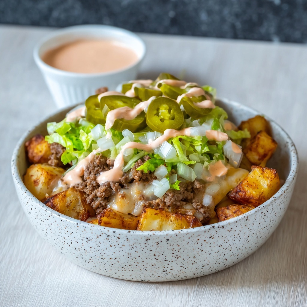 This Loaded Potato Big Mac Bowl is a hearty and flavorful dish inspired by the classic Big Mac flavors, featuring crispy oven-baked potatoes, seasoned ground beef, creamy homemade burger sauce, and melty cheese, all topped with fresh lettuce and pickles for a satisfying meal perfect for four servings.