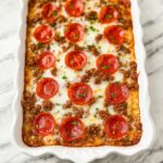 A delicious low-carb deep dish pizza quiche combining the flavors of classic pizza with a creamy, cheesy egg base. This recipe uses mozzarella and Parmesan cheeses, Italian sausage, and pepperoni to create a hearty and satisfying dish perfect for brunch, lunch, or dinner.