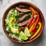 This Low Carb Steak Fajita Bowl is a bold, fresh, and flavor-packed dish featuring marinated flank or skirt steak seared to perfection, sautéed bell peppers and onions, and a bed of seasoned cauliflower rice. Topped with creamy avocado, fresh salsa, and dairy-free sour cream, this bowl is perfect for a satisfying low-carb meal that doesn’t compromise on taste.