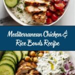 A vibrant and wholesome Mediterranean Chicken & Rice Bowls recipe featuring marinated chicken breasts cooked to perfection, served over fluffy white rice with fresh cucumber, grape tomatoes, chickpeas, red onion, creamy feta cheese, hummus, and tzatziki sauce. This 35-minute meal is perfect for a quick, healthy, and flavorful lunch or dinner for four.