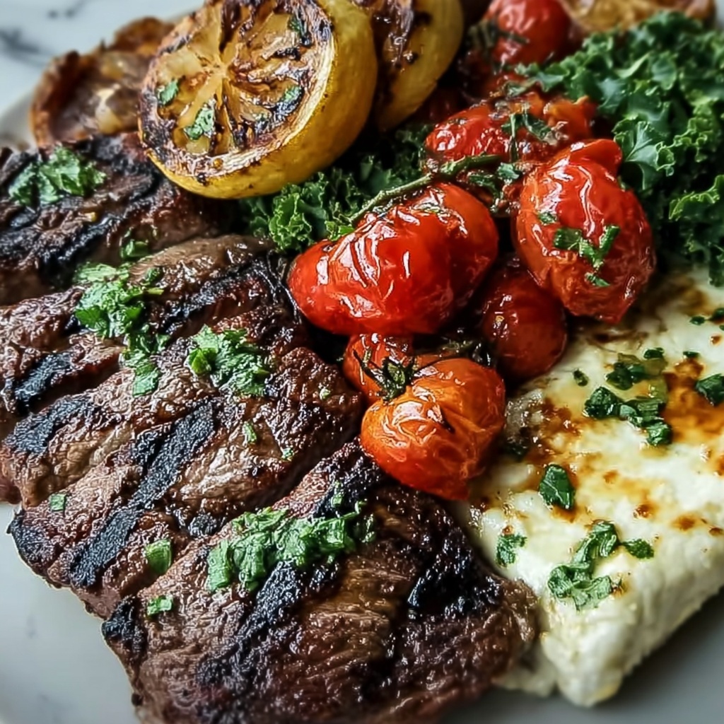 Divide your choice of cooked grains — brown rice, quinoa, or couscous — between four bowls. Layer on the steak slices followed by fresh cherry tomatoes, cucumber, red onion, Kalamata olives, and a generous sprinkle of crumbled feta cheese. Add a spoonful of hummus or tzatziki if desired. Finally, drizzle everything with the lemon garlic dressing and garnish with fresh parsley or mint. Serve your Mediterranean Steak Bowls Recipe warm or chilled, whichever you prefer.