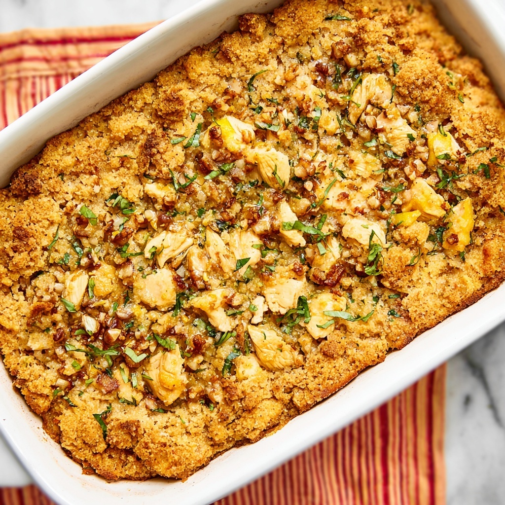 - Assemble Cobbler: Spoon the chicken and rice mixture into the center of the baking dish so that the batter forms a ring around the edges, encasing the filling.