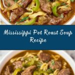 This comforting Mississippi Pot Roast Soup combines tender chuck roast and bold flavors from ranch and Au Jus mixes with pepperoncini peppers and egg noodles, slow-cooked to perfection for a hearty and satisfying meal.