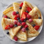 Once all the crepes are cooked, gently fill each one with a generous handful of the fresh strawberries, blueberries, and raspberries. Fold or roll them up, and finish with a sprinkle of powdered sugar for that perfectly sweet and pretty touch.