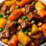 Mom’s Old Fashioned Vegetable Beef Soup is a hearty and comforting homemade soup featuring tender beef stew meat simmered with fresh vegetables and aromatic herbs. This classic American recipe blends savory beef broth with garden vegetables like carrots, celery, and potatoes to create a rich, flavorful stew perfect for chilly days or meal prep.